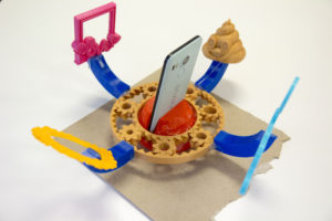 Over the course of the 24 hour event, participants brainstormed, designed and 3D printed their final design from scratch. To aid them in that process, Lucas Ewing from Autodesk and Michael Maher from Solidworks came to give workshops and tutorials of each company’s respective 3D design software. When it came to physically printing their designs, participants used their own printers, those owned by Deis3D or Brandeis’ MakeLab, as well as four lent by MakerGear. By Saturday evening, more than 50 different 3D printers were at work!